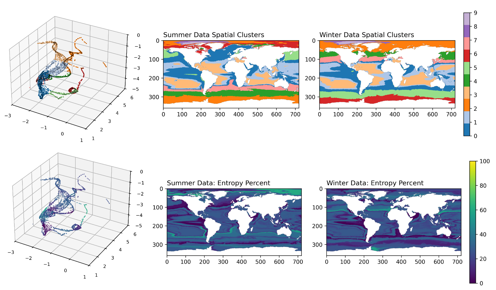 Eco-provinces of summer and winder data. Top left shows ten eco-provinces in manifold space, with geographical projections to the right. Colours correspond to distinct biomes. Below, the same showing the uncertainty per point. Dark colours signify low uncertainty.